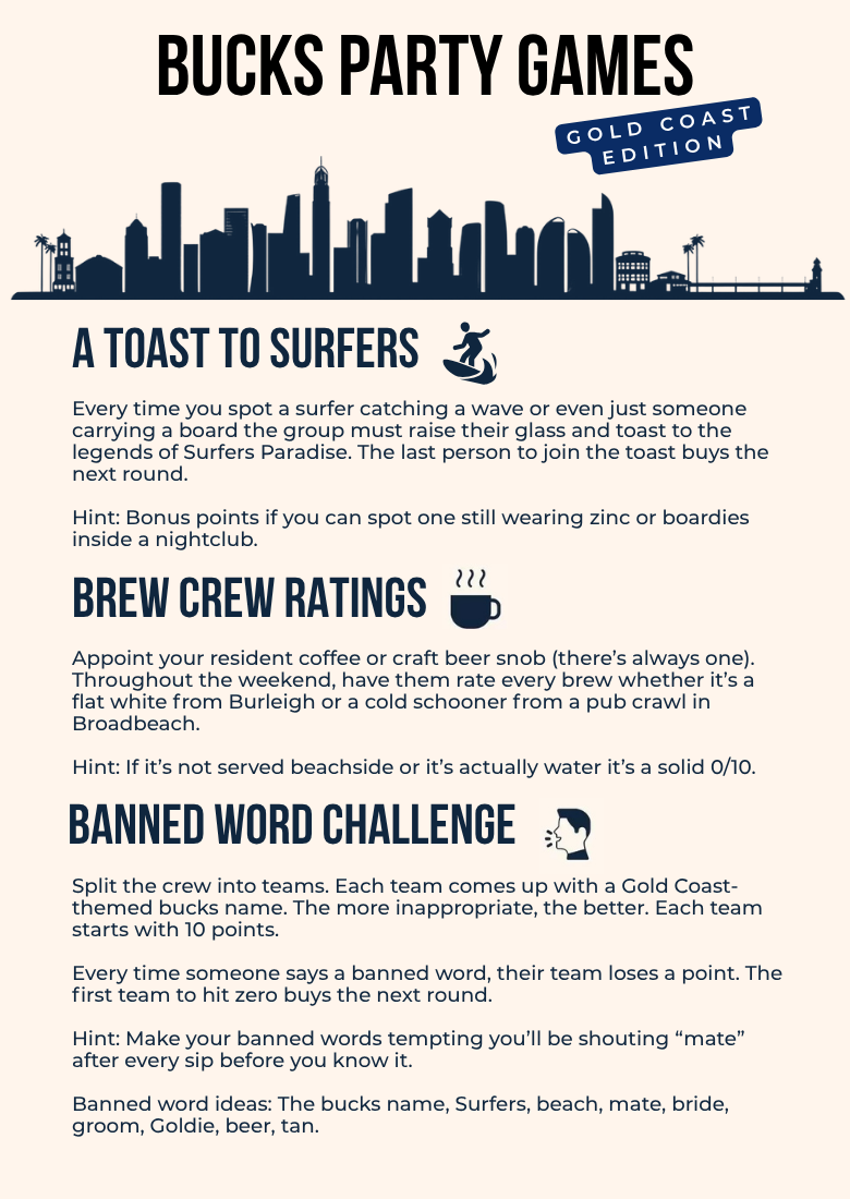 Whether you're teeing up a surprise bucks night, a hinterland brewery tour, or a rooftop pub crawl through Surfers and Broadbeach, giving the boys notice means fewer dropouts and more time to argue over who’s bringing the esky. So pick the date, sort the package, and send those bucks party invites ASAP future you will thank you.