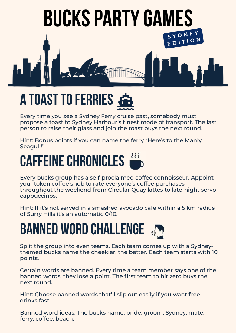 Whether you’re cruising Sydney Harbour, sinking schooners in The Rocks, or bar-hopping through Darling Harbour, these games keep the laughs flowing and the vibe high. Add them to any of our Sydney bucks packages and watch the mayhem unfold.